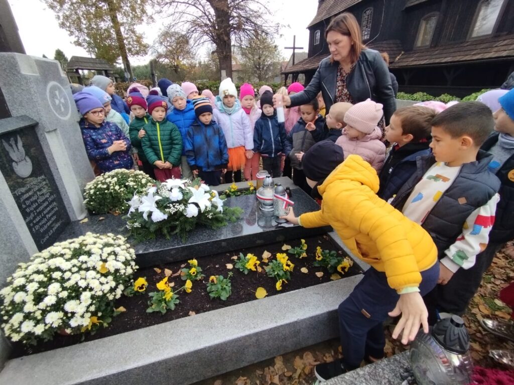 Dzieci z najstarszych grup przedszkolnych odwiedziły pobliski cmentarz, aby uczcić pamięć tych, którzy odeszli, oraz lepiej zrozumieć znaczenie nadchodzącego Dnia Wszystkich Świętych. Była to wyjątkowa lekcja szacunku, pamięci i tradycji. Wspólnie zapaliliśmy znicze, ucząc się, jak ważne jest pielęgnowanie pamięci o bliskich.